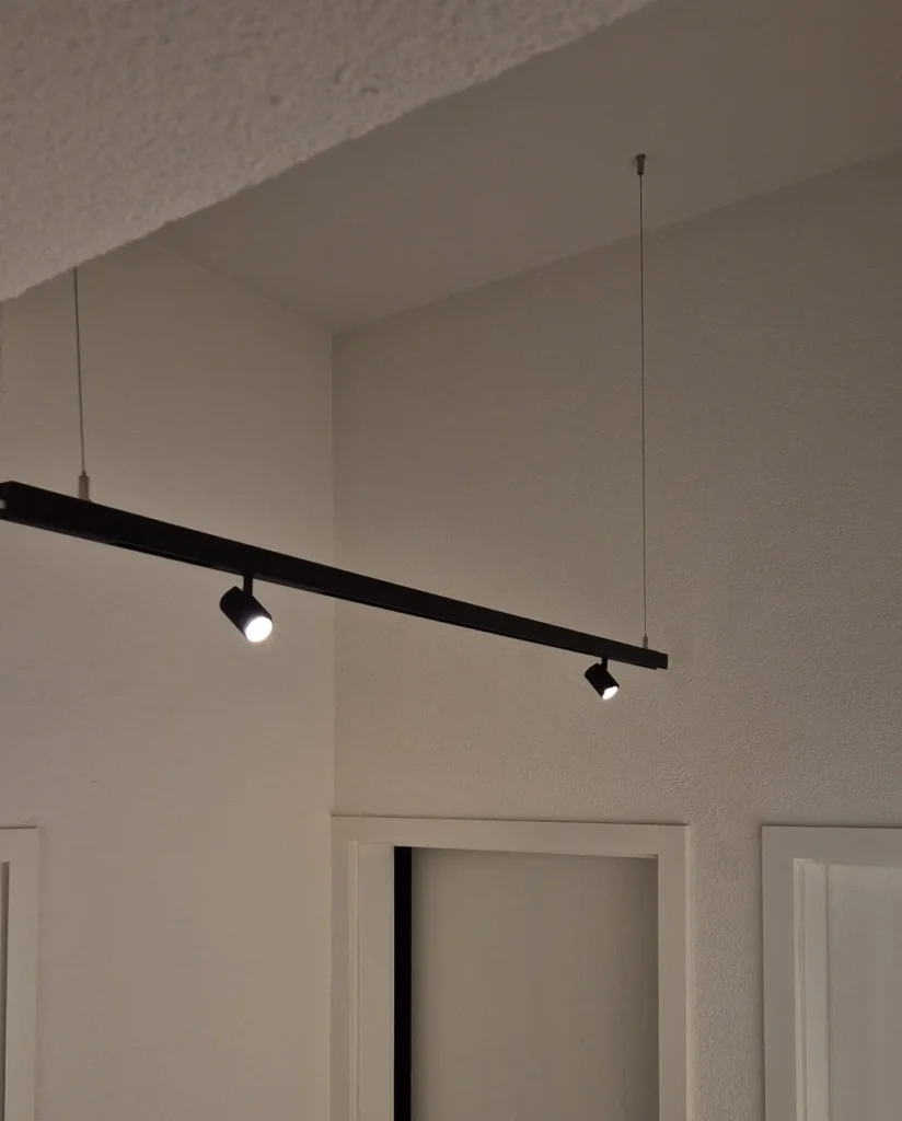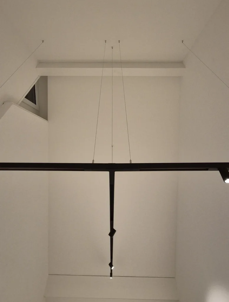 Hierfür empfahl sich das STREX-System von Wever&Ducré. Die filigrane 48-Volt-Schiene liess sich sowohl direkt an der Decke als auch pendelnd montieren.