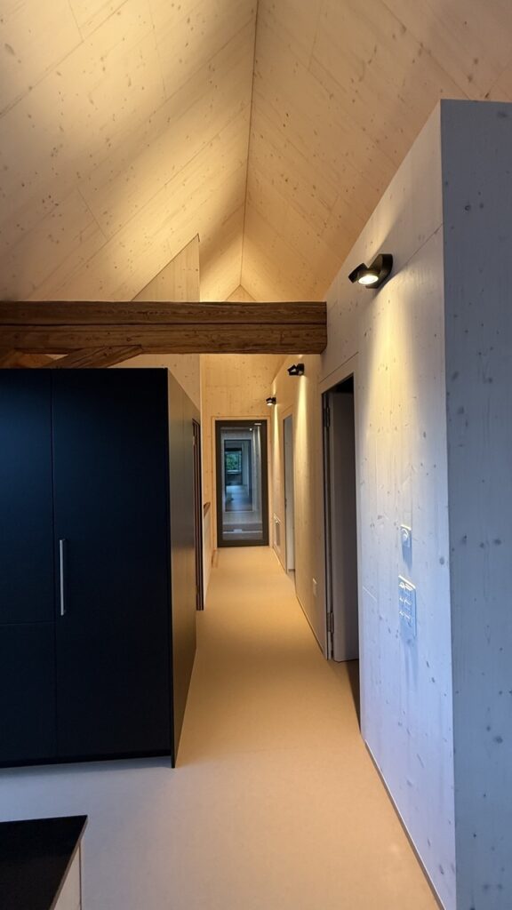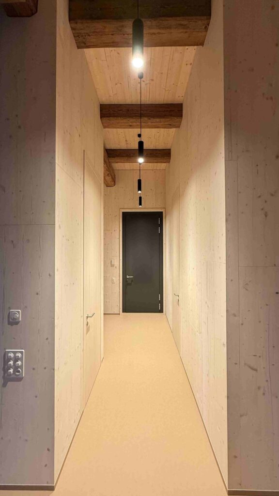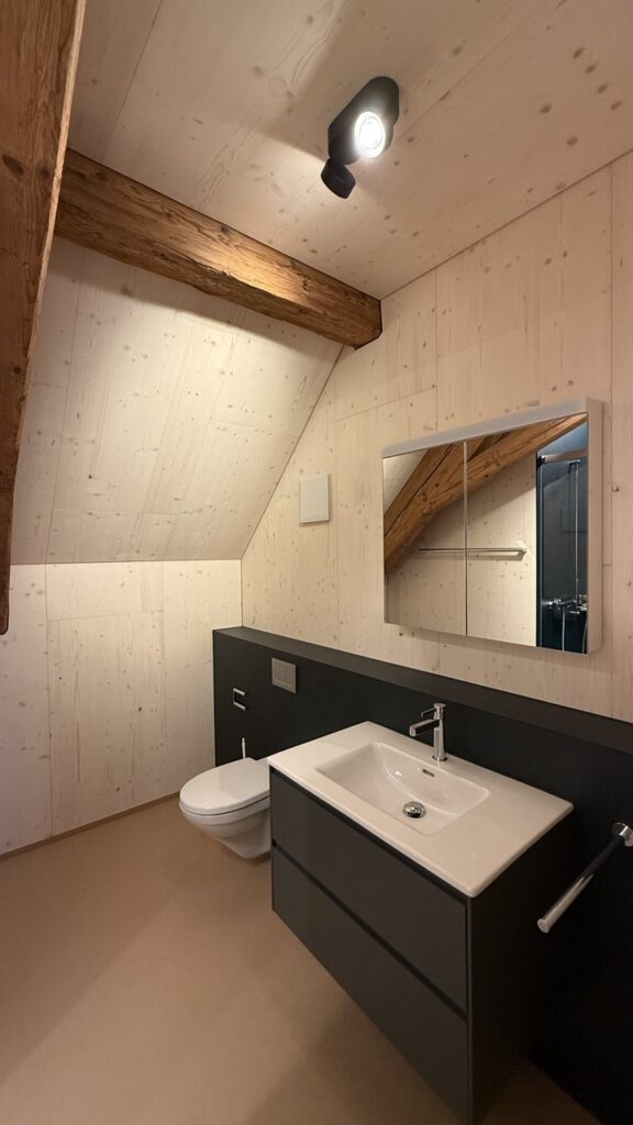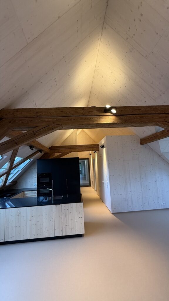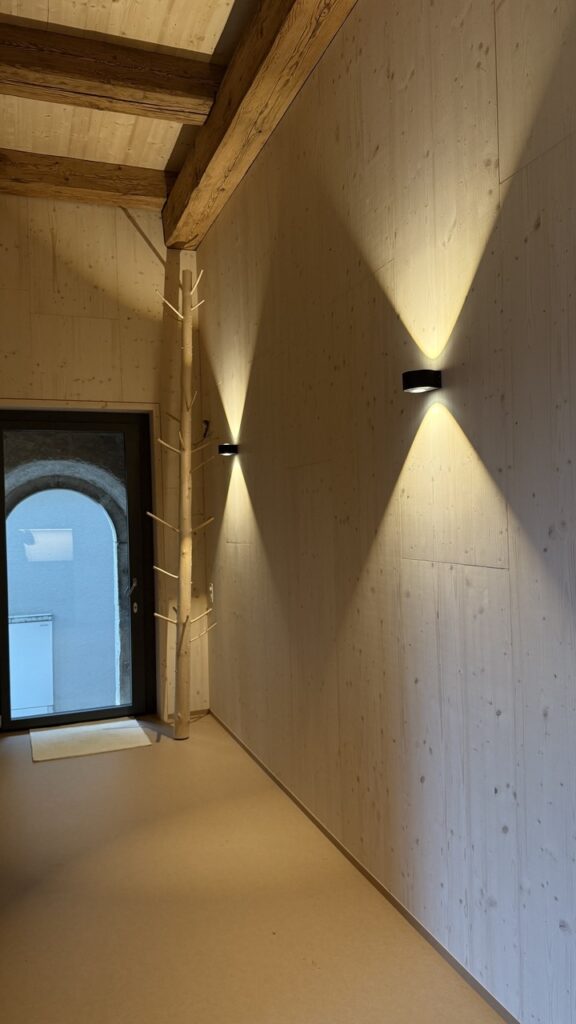 Auch die alte Trottenstube haben wir im Originalzustand bewahrt und lediglich mit einem dezenten 48V-Schienensystem ausgestattet. Damit lässt sich die Beleuchtung flexibel anpassen – von behaglich-warm bis stimmungsvoll-akzentuiert – ohne den einzigartigen Charakter des Raumes zu verfälschen.