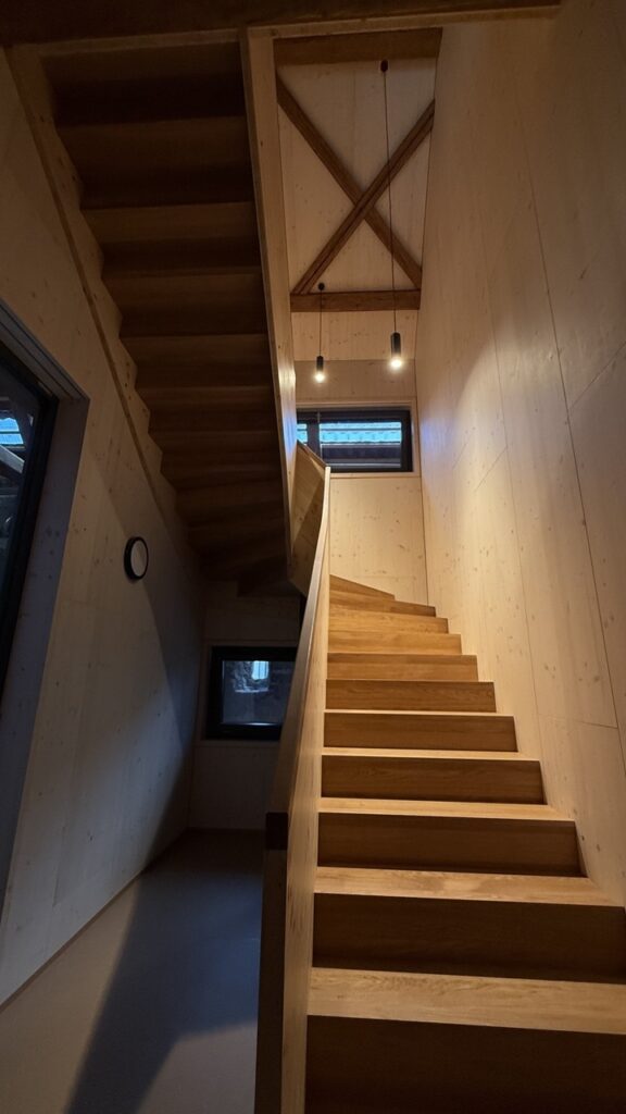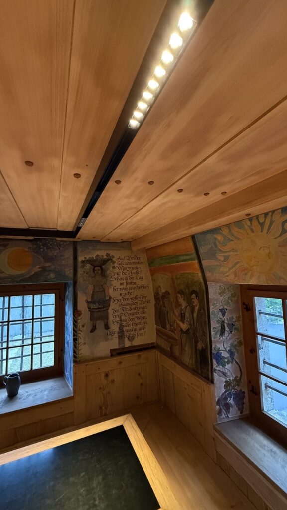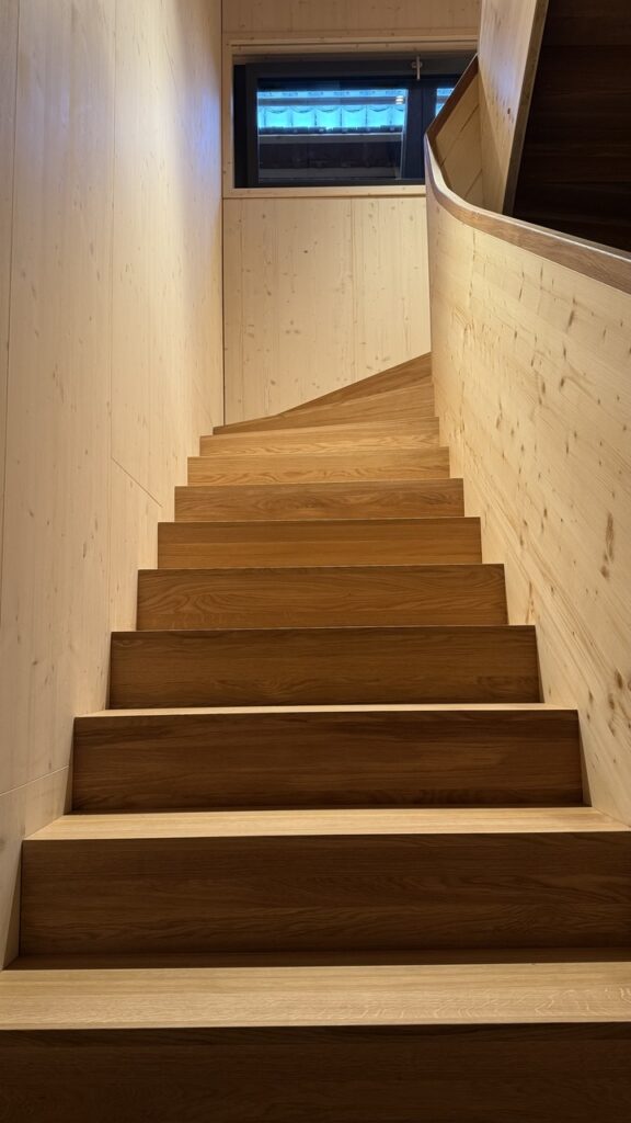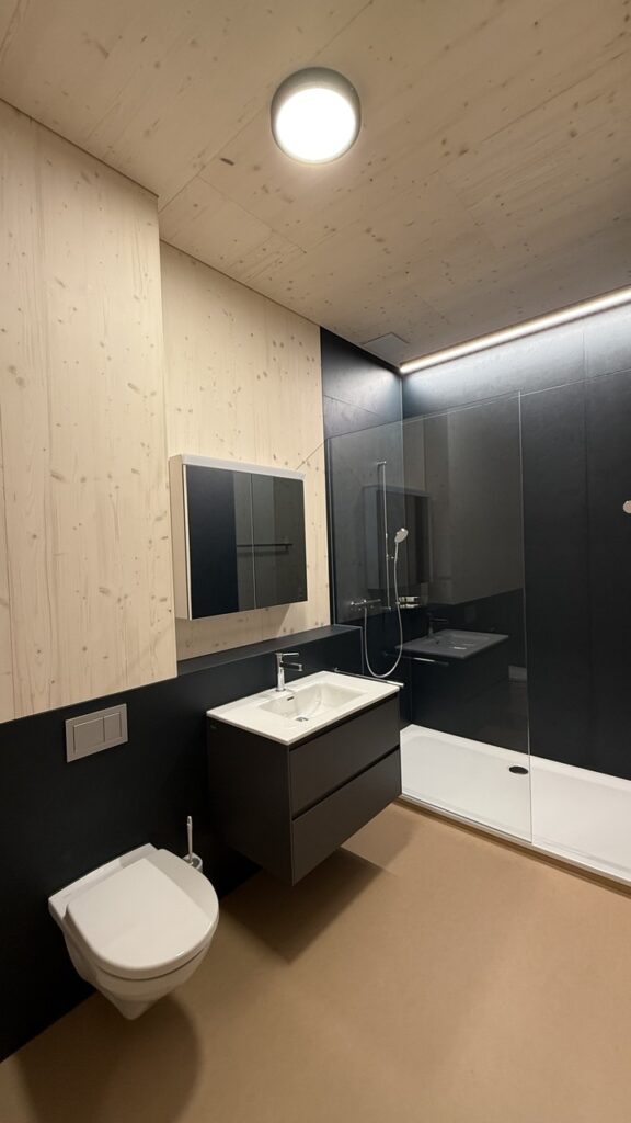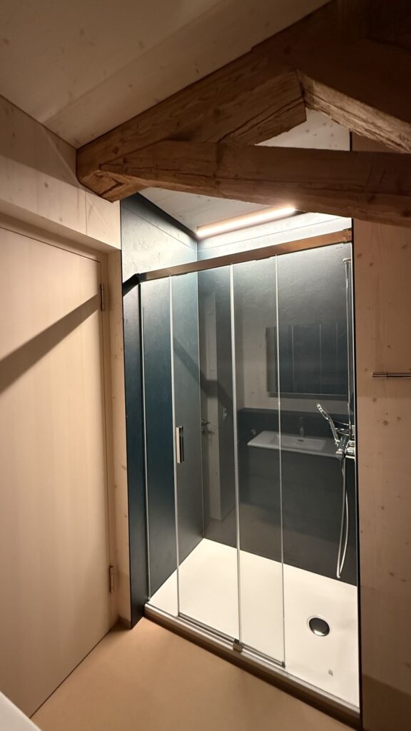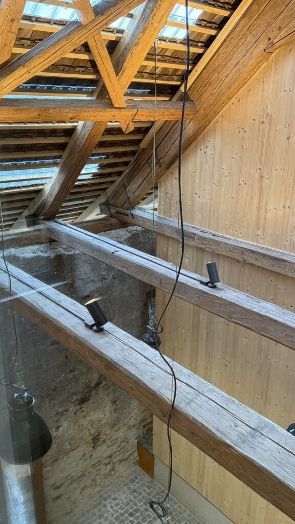 Auch die alte Trottenstube haben wir im Originalzustand bewahrt und lediglich mit einem dezenten 48V-Schienensystem ausgestattet. Damit lässt sich die Beleuchtung flexibel anpassen – von behaglich-warm bis stimmungsvoll-akzentuiert – ohne den einzigartigen Charakter des Raumes zu verfälschen.